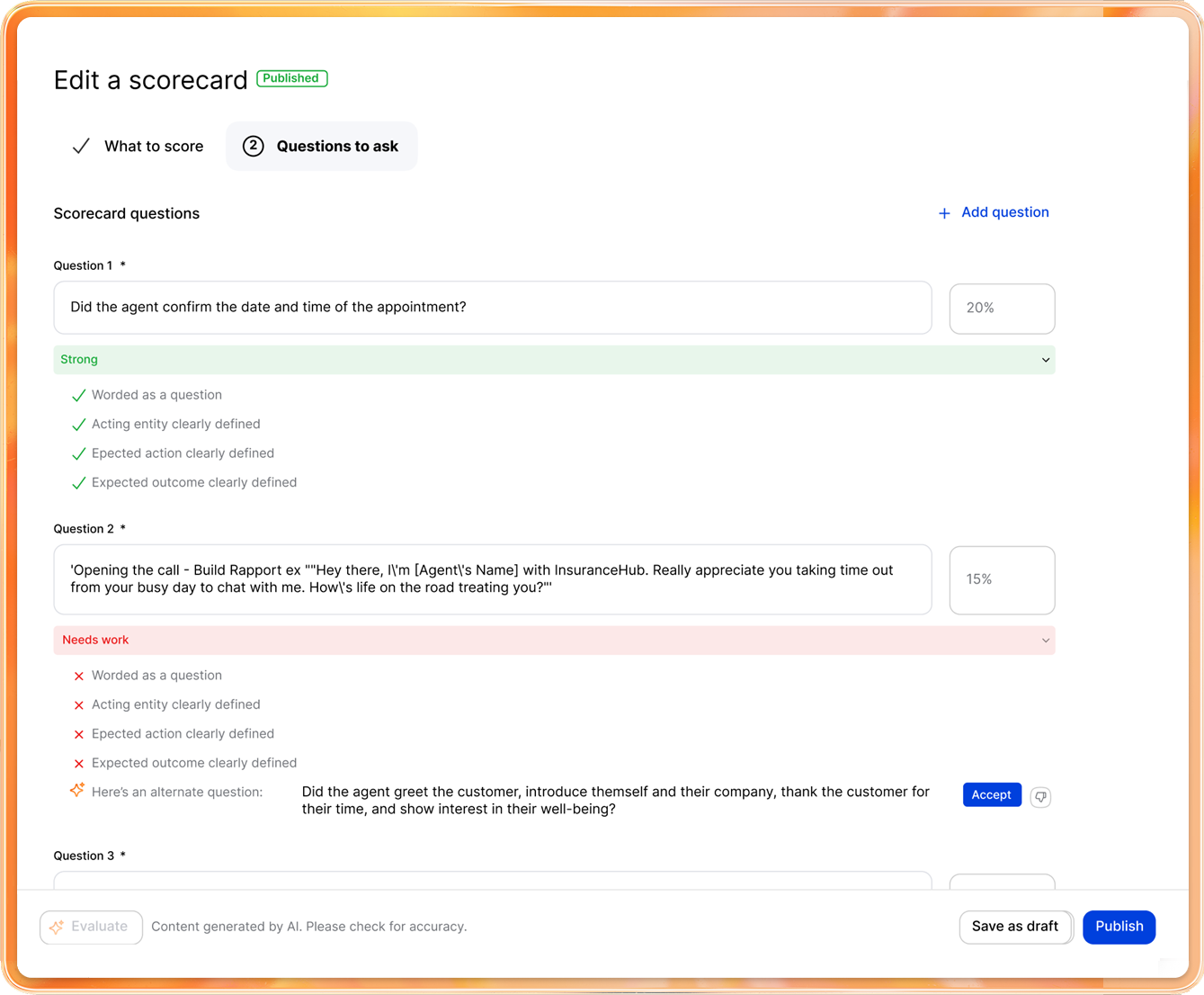 Creating objective questions for agent scorecards has traditionally been a resource-intensive, time-consuming process for quality managers. The new AI Assisted Scorecard Calibration capability provides guidance in developing scorecards, ensuring clarity and objectivity by defining entities, identifying actions, and evaluating if there is clear success criteria for each question. It also analyzes existing scorecards and provides data-driven recommendations to improve questions over time and identifies obsolete or ineffective questions.