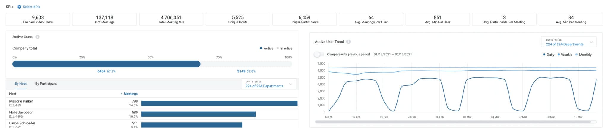 RingCentral’s Adoption and Usage Analytics provides comprehensive details about how employees are adopting and using video meetings and features in RingCentral Video.  These insights can help to inform adoption, training, and app upgrade programs.