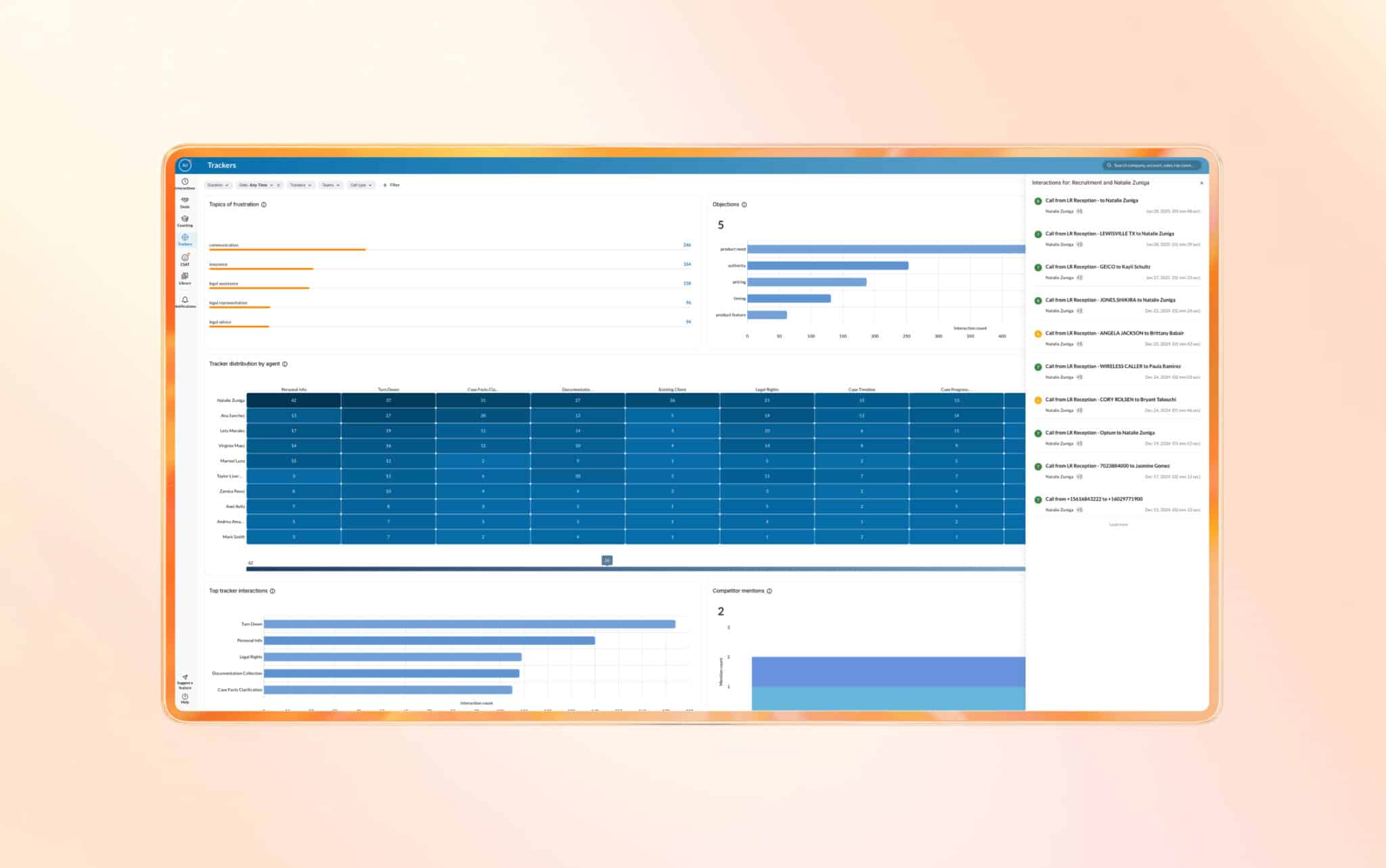 The redesigned Trackers Dashboard puts agent and customer trackers on a single page. Toggle between raw numbers and percentages, scan trends with cleaner charts, and click into data points to immediately access the underlying interactions.