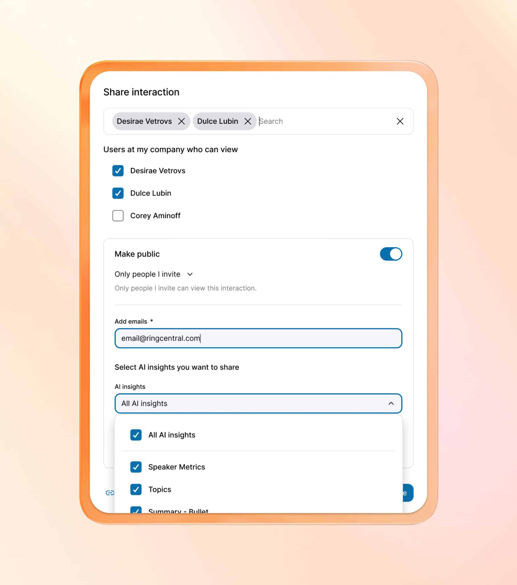 You no longer have to send full transcripts when sharing externally. Now you can choose which insights to include – summaries, speaker metrics, or key topics – so what you send is focused and purposeful.