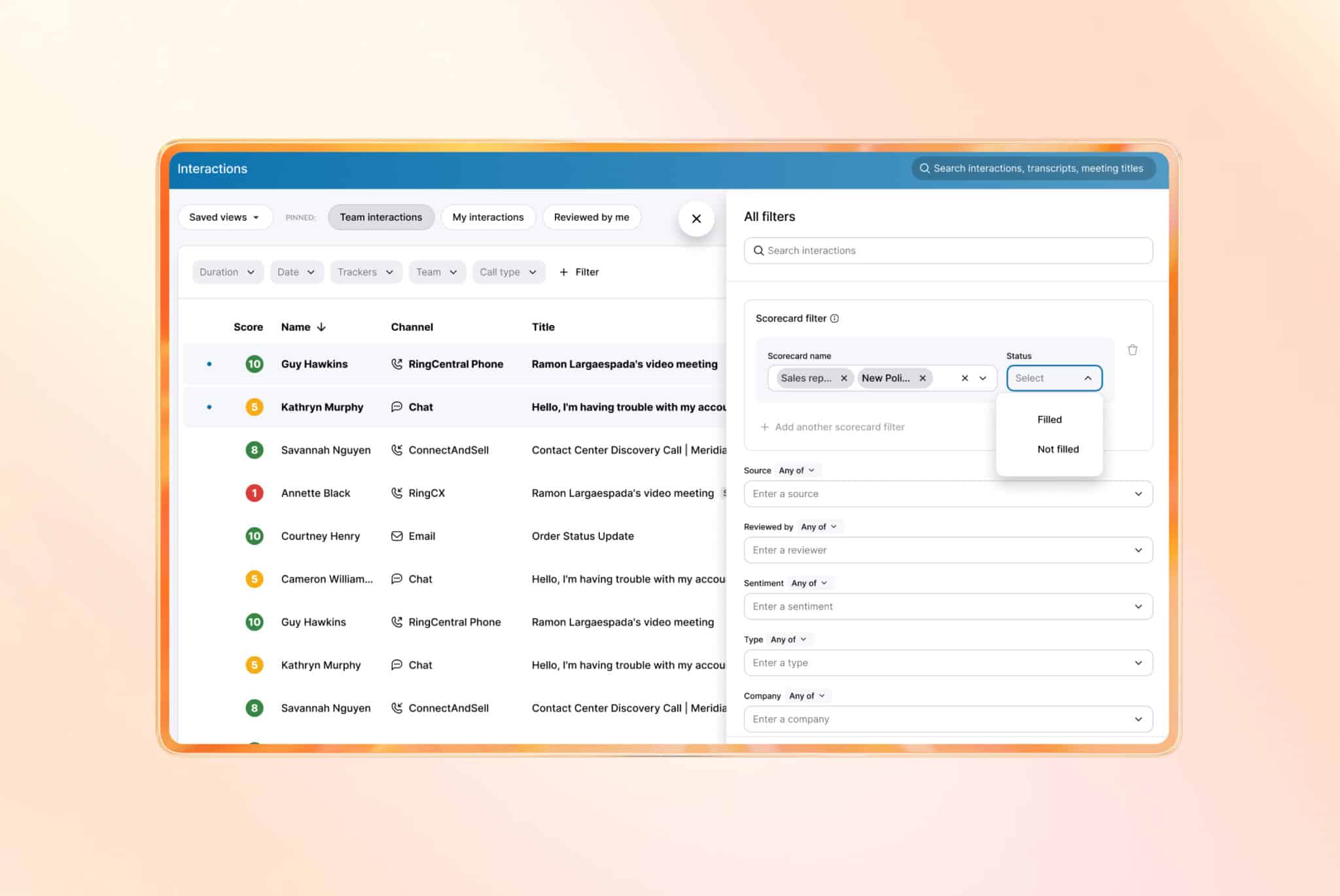 New scorecard filters let you target the calls that matter by score range, reviewer type, status, or scorecard. It’s faster to spot issues, review trends, and track evaluator consistency.