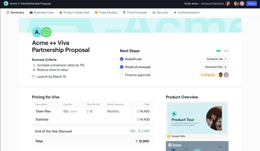 But once a lead is generated and handed over to sales, the process often gets a lot less efficient and reps are often using their own pitch decks, CRM processes, proposal template and more. This lack of optimization is not only costing your reps time, but it’s likely costing you closed deals too.