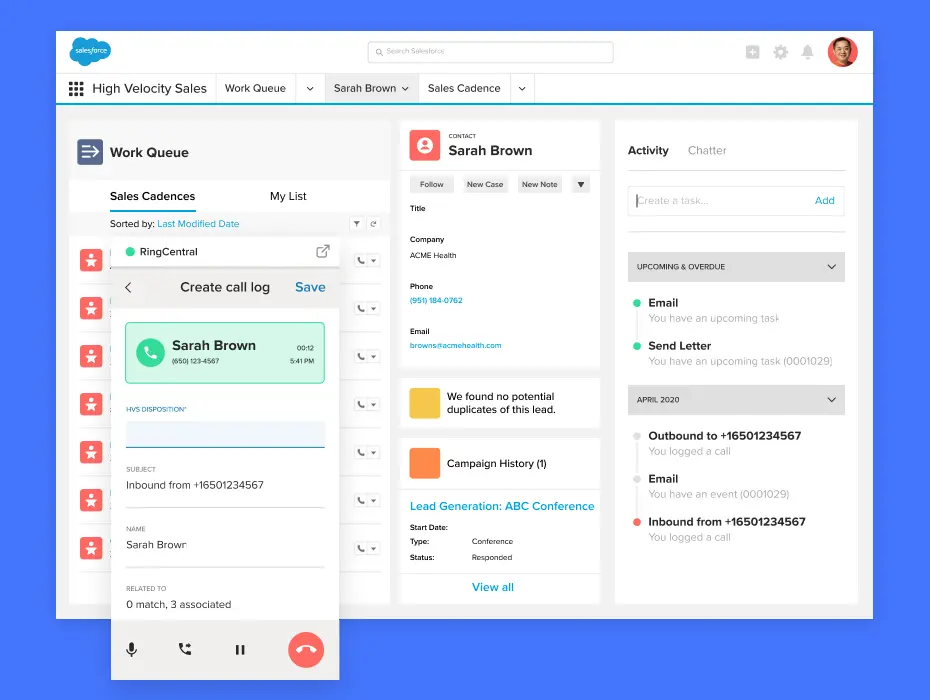 This is why the RingCentral for Salesforce integration is crucial. Now supporting High Velocity Sales, RingCentral for Salesforce allows reps to click to call right from their work queues and automatically provides the appropriate scripts for agents to follow.