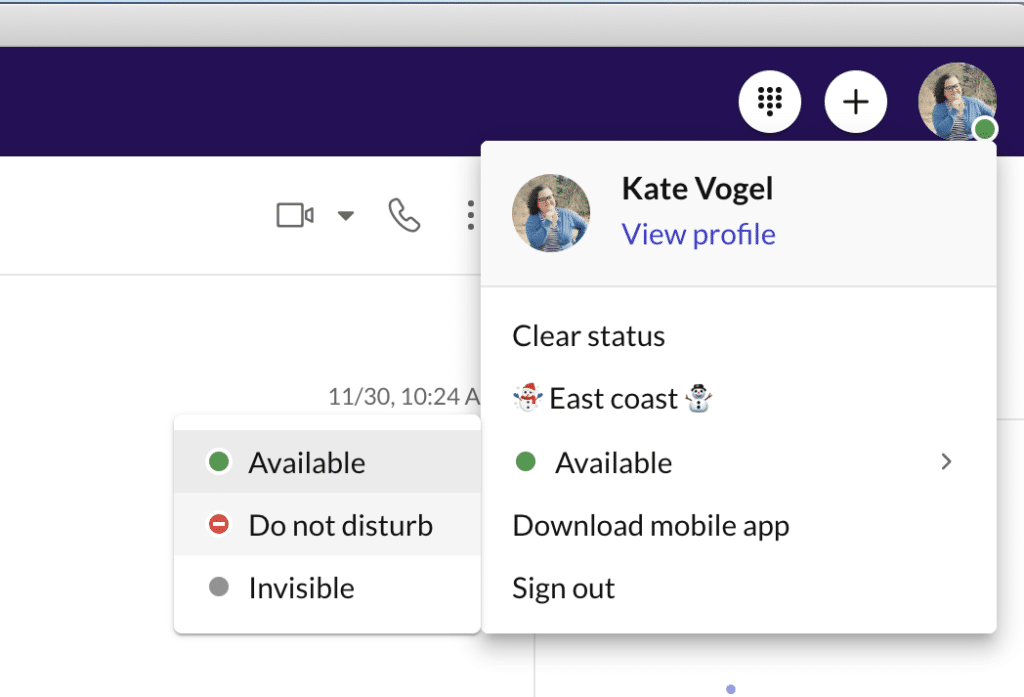 One way RingCentral allows employees a break during the day is the “Do not disturb” status on the RingCentral app. Employees can mark their status with “Do not disturb,” and message notification pop-ups will not appear. If someone does contact the employee, the messages will still be there, but the employee doesn’t need to review them until they are ready to look at them: