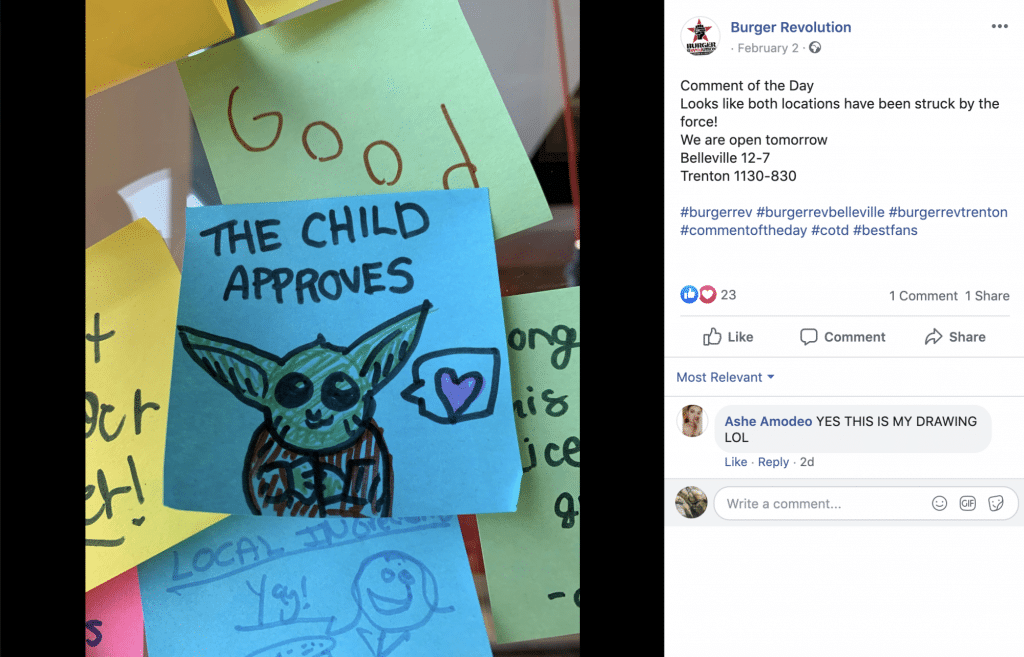 They do this by sharing content from their customers, but not in the way most restaurants might do. Burger Revolution has an ongoing social media campaign called “Comment of the Day.”