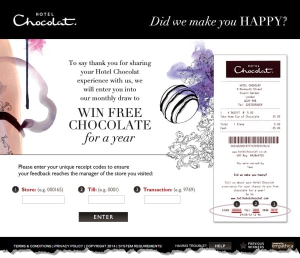 If you want to know more about how your brand is perceived, simply ask your customers. British chocolatier Hotel Chocolat uses its receipts to draw attention to a customer satisfaction survey that gives customers the chance to win a year’s supply of chocolate every time they shop in store or online.