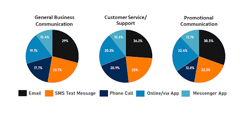Age is not the only factor that impacts communication preferences. According to a survey completed in late 2020, the reason for the communication is also a factor, as illustrated in these graphs: