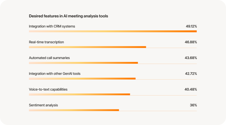 Voice interactions remain the dominant contact center channel. Voice is also an area with limited capabilities, presenting a substantial opportunity for AI to provide value. Our research identified several high-value AI voice communication features that agents are seeking in order to improve customer experiences: