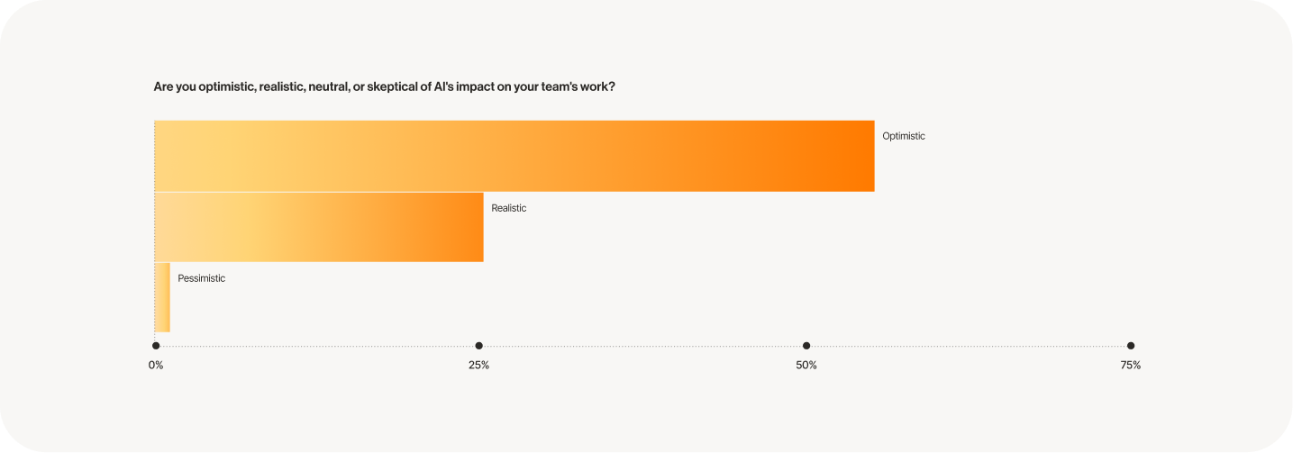Our research confirms this positive outlook, with more than 50% of respondents expressing optimism about AI’s impact on their teams’ work. When combined with the 25% who describe themselves as “realistic,” the vast majority clearly recognize AI’s transformative potential.
