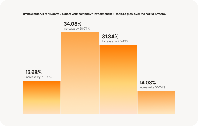 This widespread adoption comes with aggressive growth projections. Nearly 35% of respondents expect their AI investments to increase by 50% or more over the next 3-5 years.