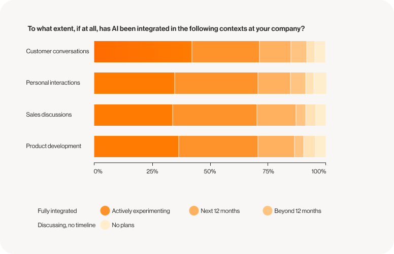 The AI revolution is here—right now. Our research reveals that AI has moved beyond the experimental phase and has become essential across enterprises. Just two years ago, most IT leaders were merely considering AI adoption. Today, over 70% are either fully implementing or actively experimenting with AI across various business functions, including contact centers.