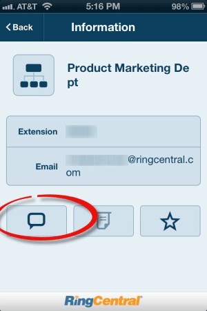 With Business SMS, It’s easy to send text messages to any contact or department in your organization. If you’re logged in to the RingCentral mobile app, simply swipe left to access the menu and click Contacts. Departments may be found in your Company contacts list; just click on one and tap the new-message icon to send an SMS to every member of that department.