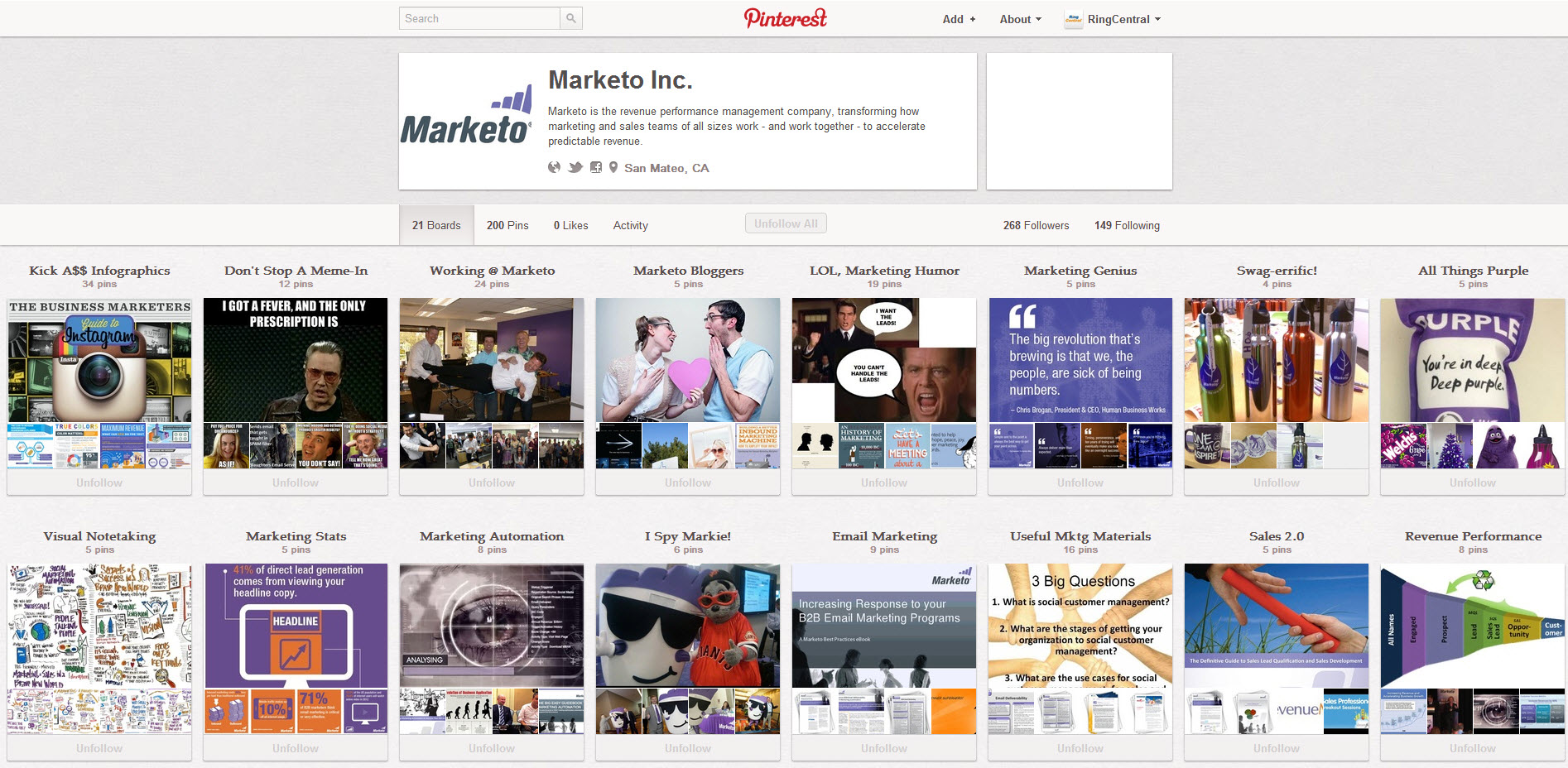 Revenue performance management company Marketo does a great job of pinning valuable business information, as well as plenty of humorous content that includes employee shenanigans.