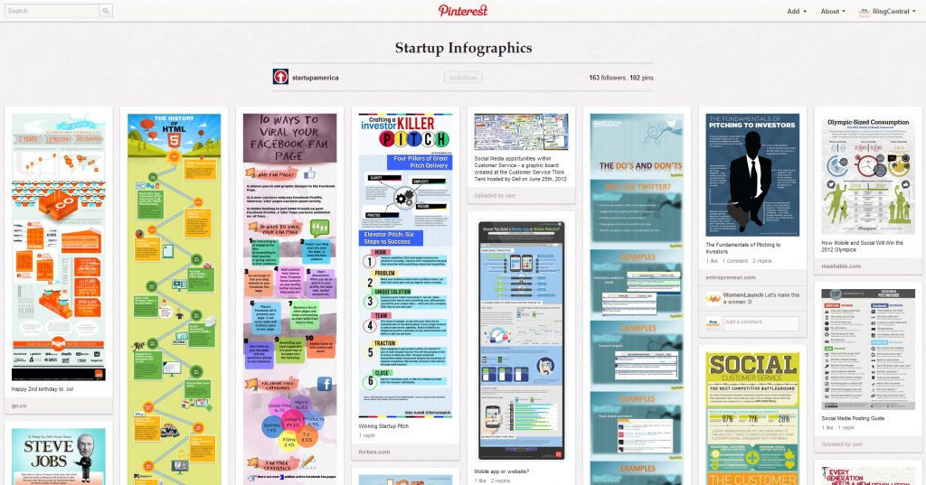 Don’t be one of those brands that posts willy nilly. Establish which topics are relevant to your business and audience (see our blog post on content strategy) and pin only content related to those topics. For example, RingCentral’s focus topics include content about our cloud telephony service, cloud industry trends, and business success tips for our B2B audience. We aim to educate and add value to entrepreneurs and business leaders with boards like Business Books We Recommend, Cloud Computing, Digital Marketing/Social Media, and Business Productivity & Success Tips.