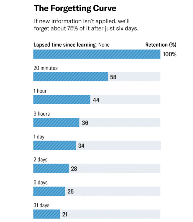 A learning dump as described above isn’t exactly conducive to either satisfactory learning experiences or long-term retention. Consistent, bite-sized lessons are often much more effective. According to the theory of “The Forgetting Curve,” about 75% of new information is forgotten within a week if it isn’t applied: