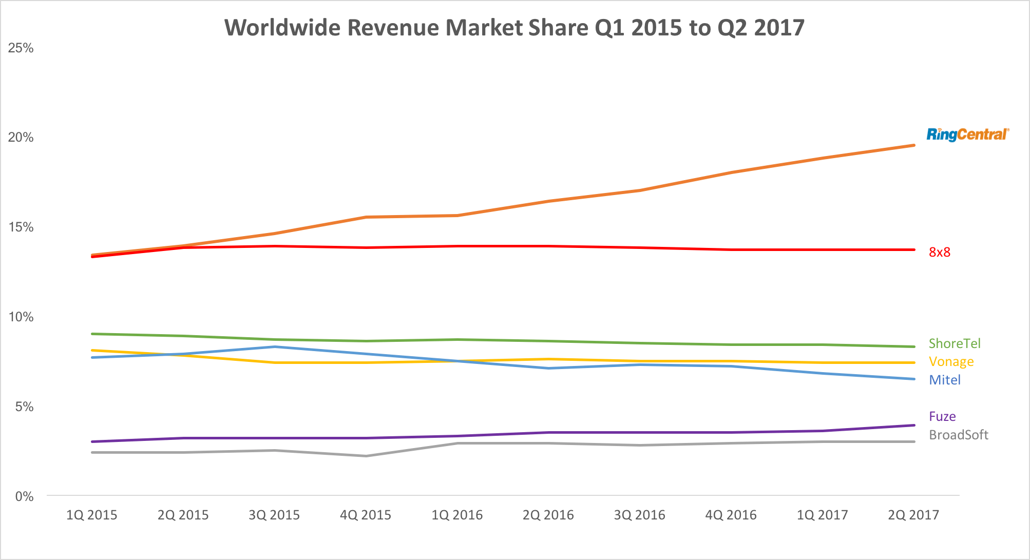 RingCentral’s market share leadership position has increased to 19.5% in Q2 2017 from 16.4% in the year ago quarter, and 18.8% in the prior quarter, according to Synergy Research Group. As shown in the chart below, RingCentral is the market share leader and is breaking away from the competition.